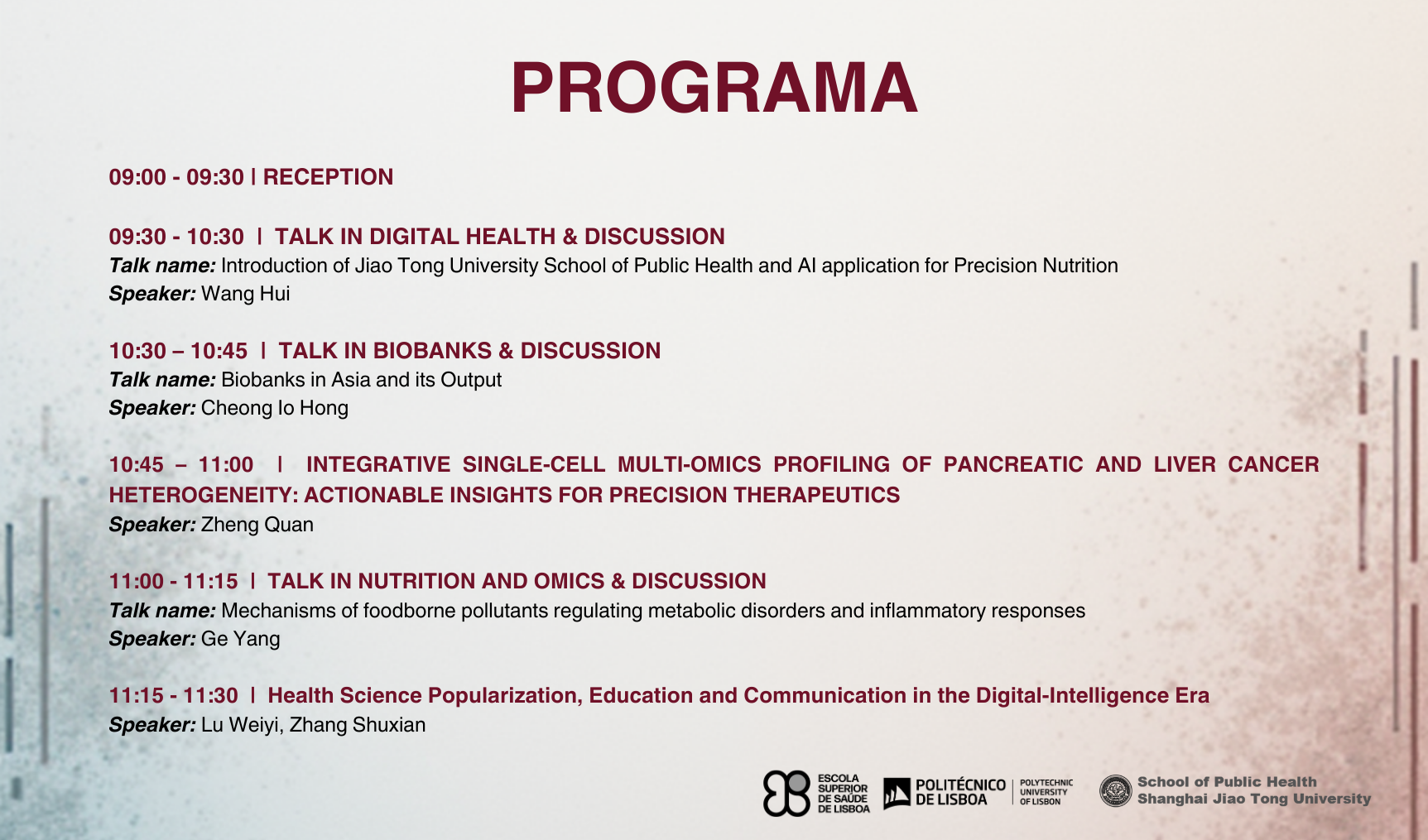 O evento terá lugar na sala 2.1 e contará com a presença de seis visitantes da Shanghai Jiao Tong University -School of Public Health (China): Professores Wang Hui, Cheong Io Hong, Zheng Quan, Ge Yang, Lu Weiyi e Zhang Shuxian, que irão dinamizar um conjunto de apresentações dedicadas às suas áreas de investigação.