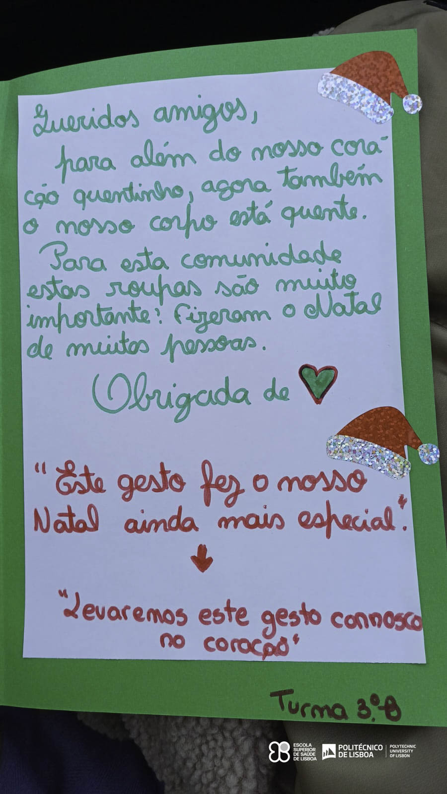 Como forma de agradecimento, as crianças da Escola EB 2,3 Professor Pedro d’Orey da Cunha prepararam uma pequena atuação e ofereceram um postal de Boas Festas, elaborado pelos próprios alunos, num gesto simbólico de reconhecimento e partilha.